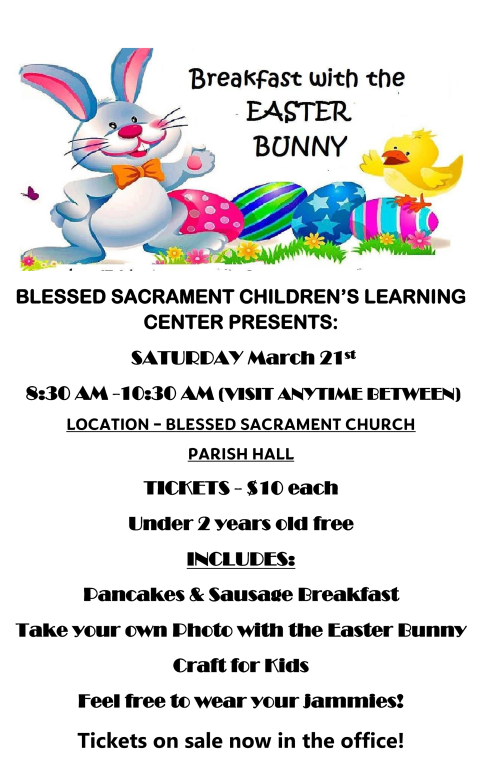 Blessed Sacrament Church operates a not-for-profit, full- and partial-day, child care and education center. The Children’s Learning Center offers a developmental program for children aged 2 through 5, Monday through Friday, 7 a.m. to 6 p.m., twelve months a year.